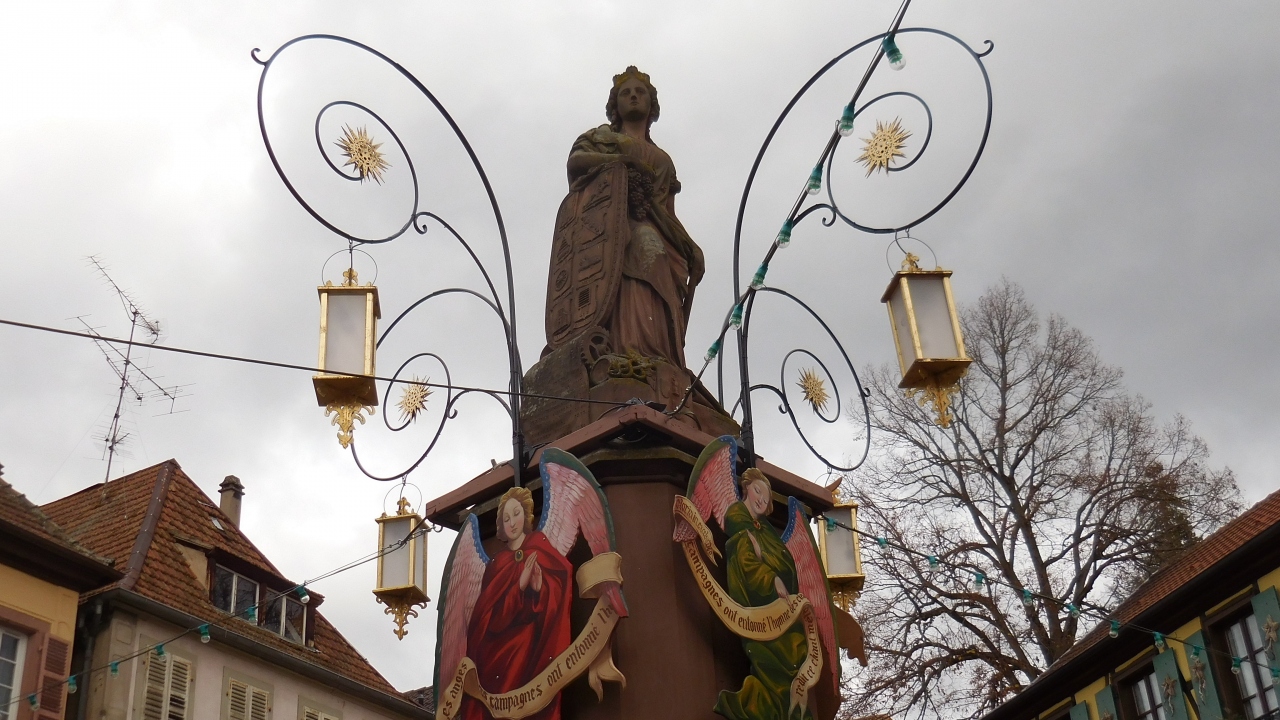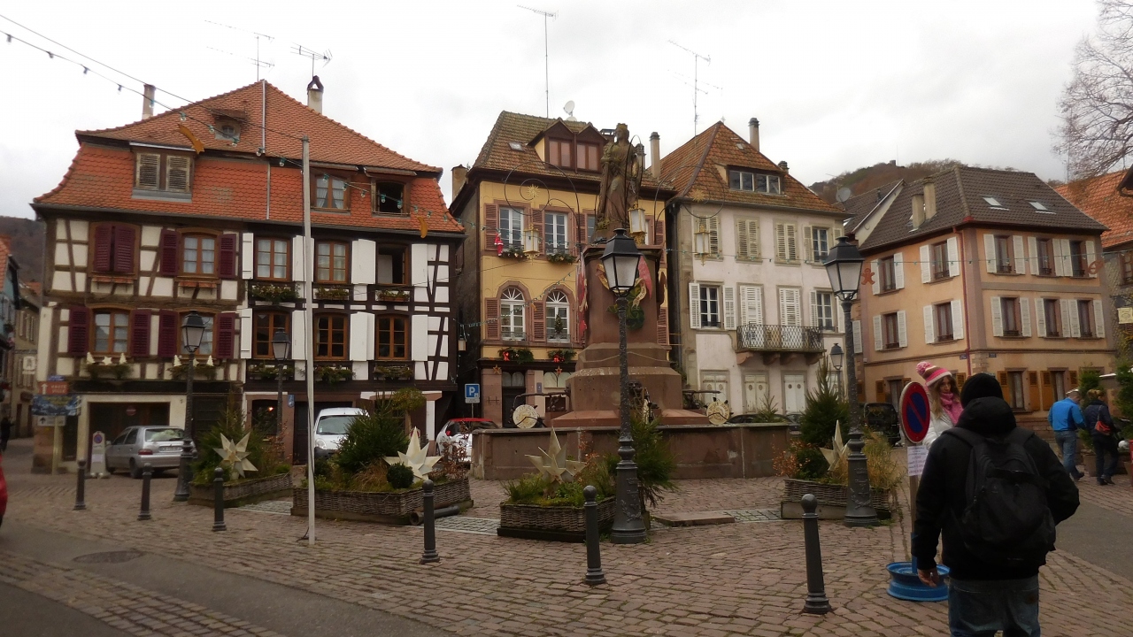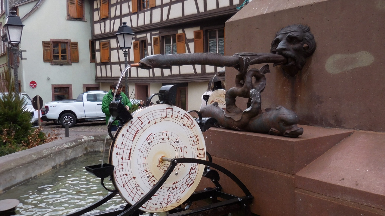 リボーヴィレ旧市街のグラン・リュ通りを歩いていくと泉のある広場に出る。中央のFriedrichの泉は1862年に建てられたもので、泉から出る水で水車を回したら音楽が奏でられる仕組みのようである。広場の周囲はアルザス風の木組みの家が並び、ロマンチックな広場である。