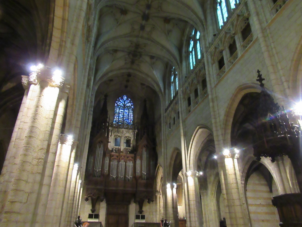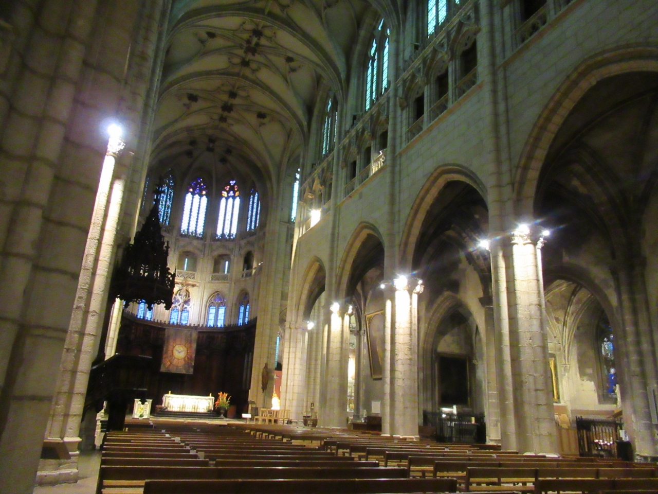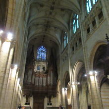 シックな外観の教会で、教会の中も静けさが漂っていました。天井が高く、高い位置にある窓は全てステンドグラスになっていました。派手な装飾がない分、ステンドグラスの素敵さが際立っていました。