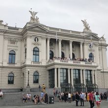 チューリッヒ駅から、リンデンホフの丘、聖ペーター教会、フラウミュンスター と歩いて、ミュンスター橋を渡ってグロスミュンスター 、最後にチューリッヒ湖にたどり着きました。休日だったせいか湖畔は遊園地のような状態になっていました。その奥にこのチューリッヒ歌劇場がありました。意外と立派な建物で、2階にいる観光客が手を振っていました。