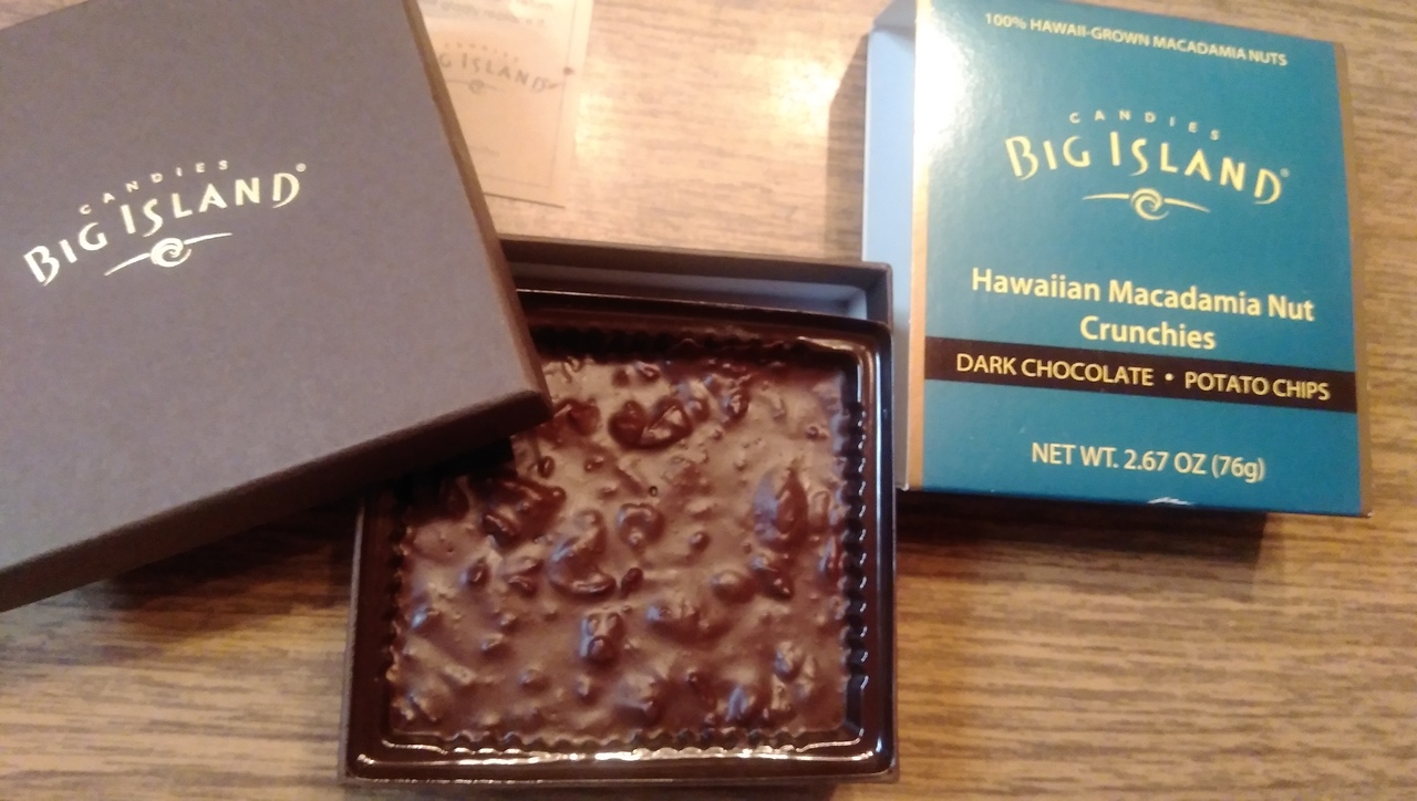 帰国してこのチョコレートを開けてみたら、5センチ四方のぶ厚いマカダミアナッツ入りのチョコレートでした。うーん、小粒で食べやすかったらパーフェクト。