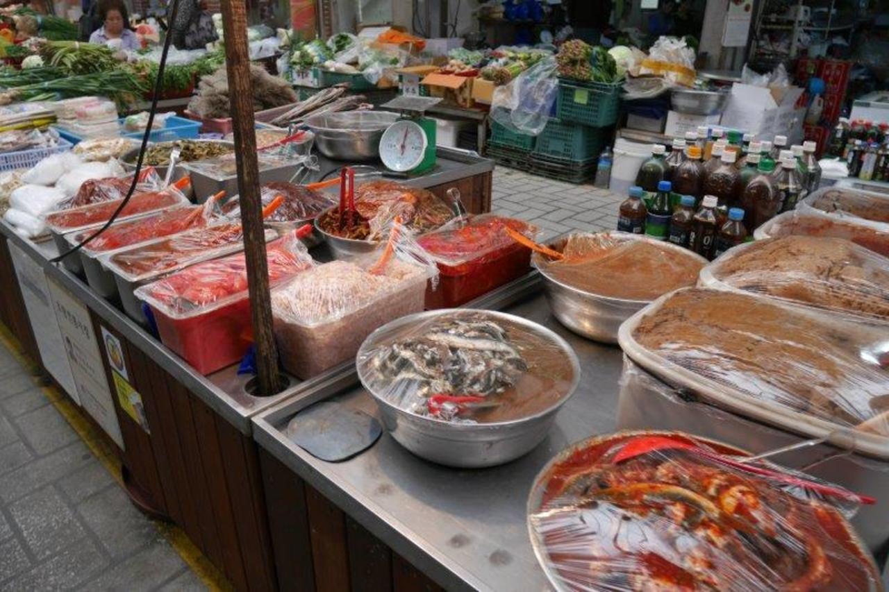 スーパーへ行き慣れている日本人としては、こちらの商店街で買い物する勇気はちょっとありませんでした。靴下、魚、肉、キムチ、野菜などアーケードの下で並べて売られています。韓国の市場の雰囲気を見て楽しみました。