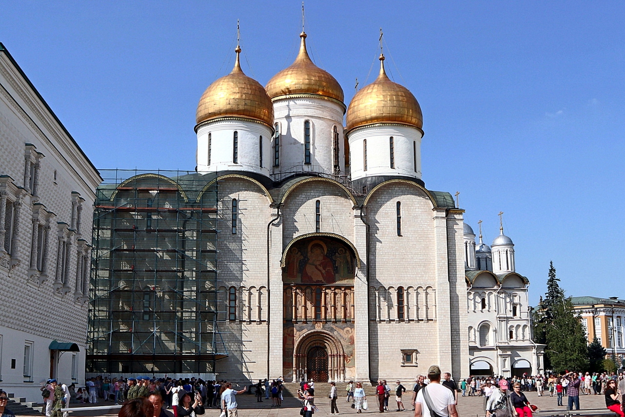 ツアーで入場観光。ロシア正教の総主教会で,歴代皇帝の戴冠式もここで行われていた。内部の写真撮影は不可。改修のため一部覆いがありましたが,何列もある高いイコノスタス,外壁や内部の壁面,柱の全面に施されたフレスコ画が素晴らしい。見どころなど入口に置かれたリーフレットに詳しい解説が掲載されています(残念ながら日本語版はありません。)。