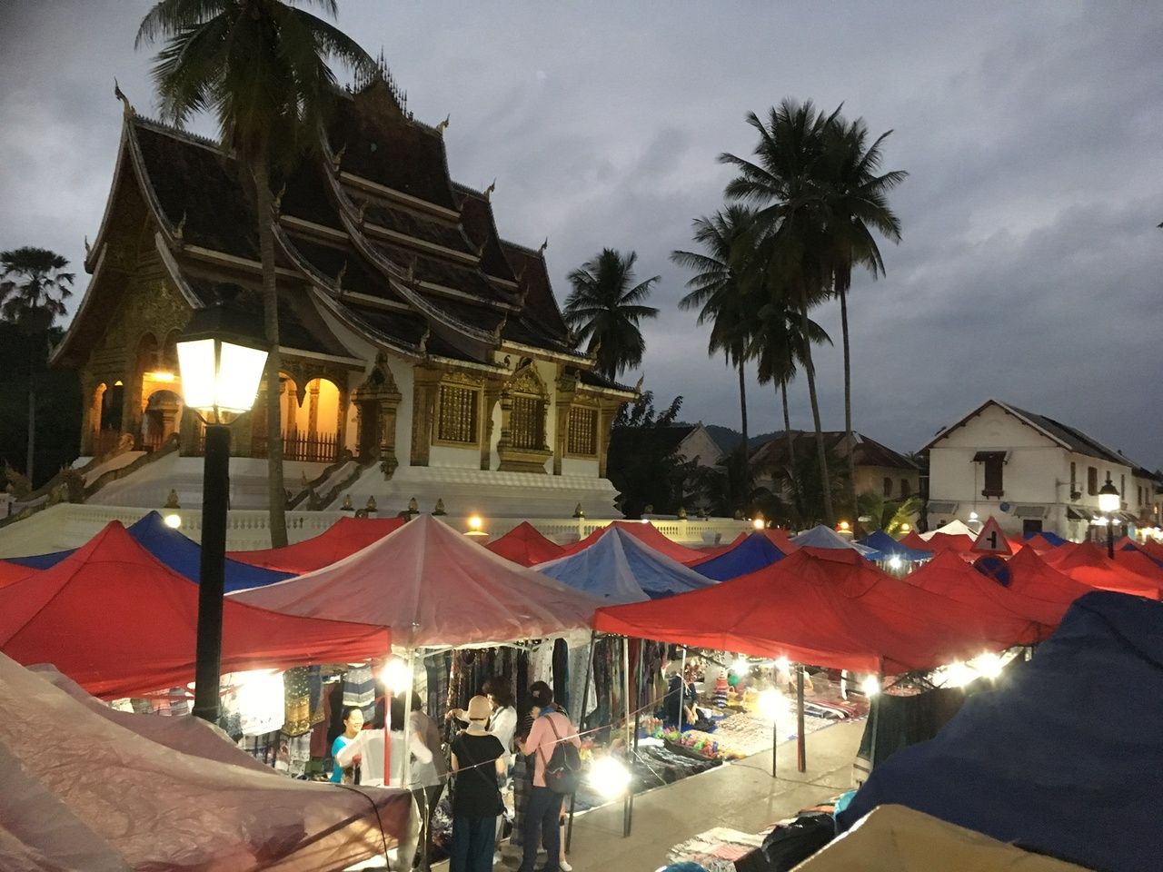 毎晩夕方5時くらいから王宮前のシーサワンウォン通りに赤いテントが並びます。可愛い小物、ラオスの織物、紙すき製品、コーヒー等等お土産を買うにはもってこいの場所です。その他に露店の食べ物屋さんも出てます。ルアンパパン滞在中毎晩通いました。