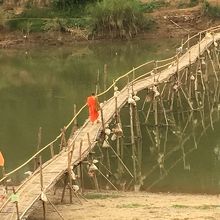 ルアンパパンのナムカーン川には乾季だけ渡れる橋があります。メコン川との合流の近くに1つと、もう少し下の方に1つあります。下の方の橋を渡ってみました。竹で出来ている簡単な橋で、入り口で通行料を払います。渡った先の降り口の辺りはぬかるんでいました。足が汚れる覚悟で渡ってみましょう。渡った先にはカフェがあり、川を眺めながらのティータイムも中々良かったです。
