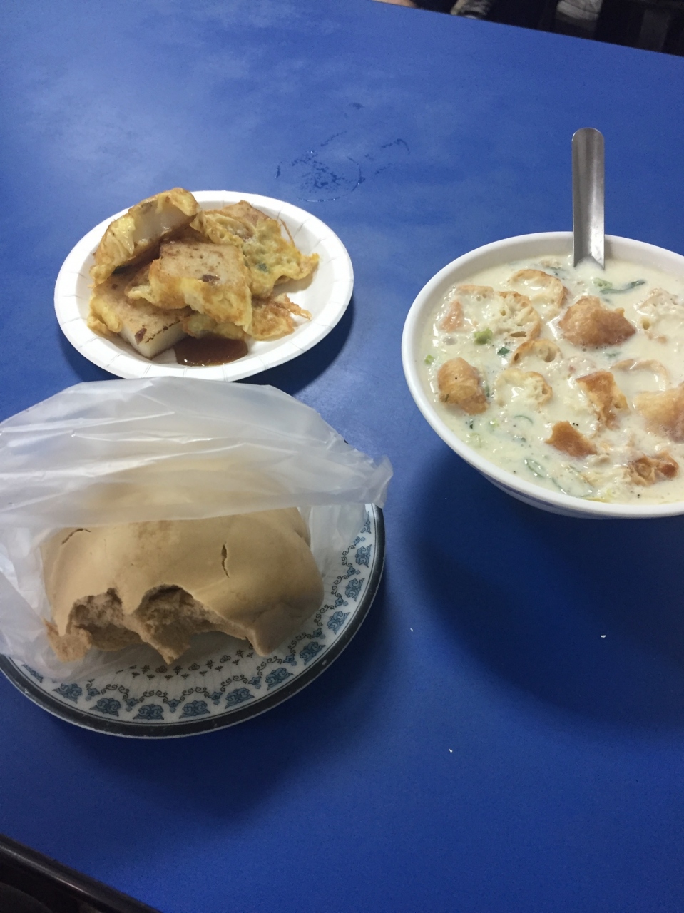 土曜日の7時前に行ったらすいてました。外帯の人がほとんどの中、朝ごはんをワイワイと食べている家族も。鹹豆漿も卵付き大根餅もウマイ。特に15元のブラウンシュガーの包子が噛むほどに淡い甘さが湧いてきて最高でした。指差しで注文できます。