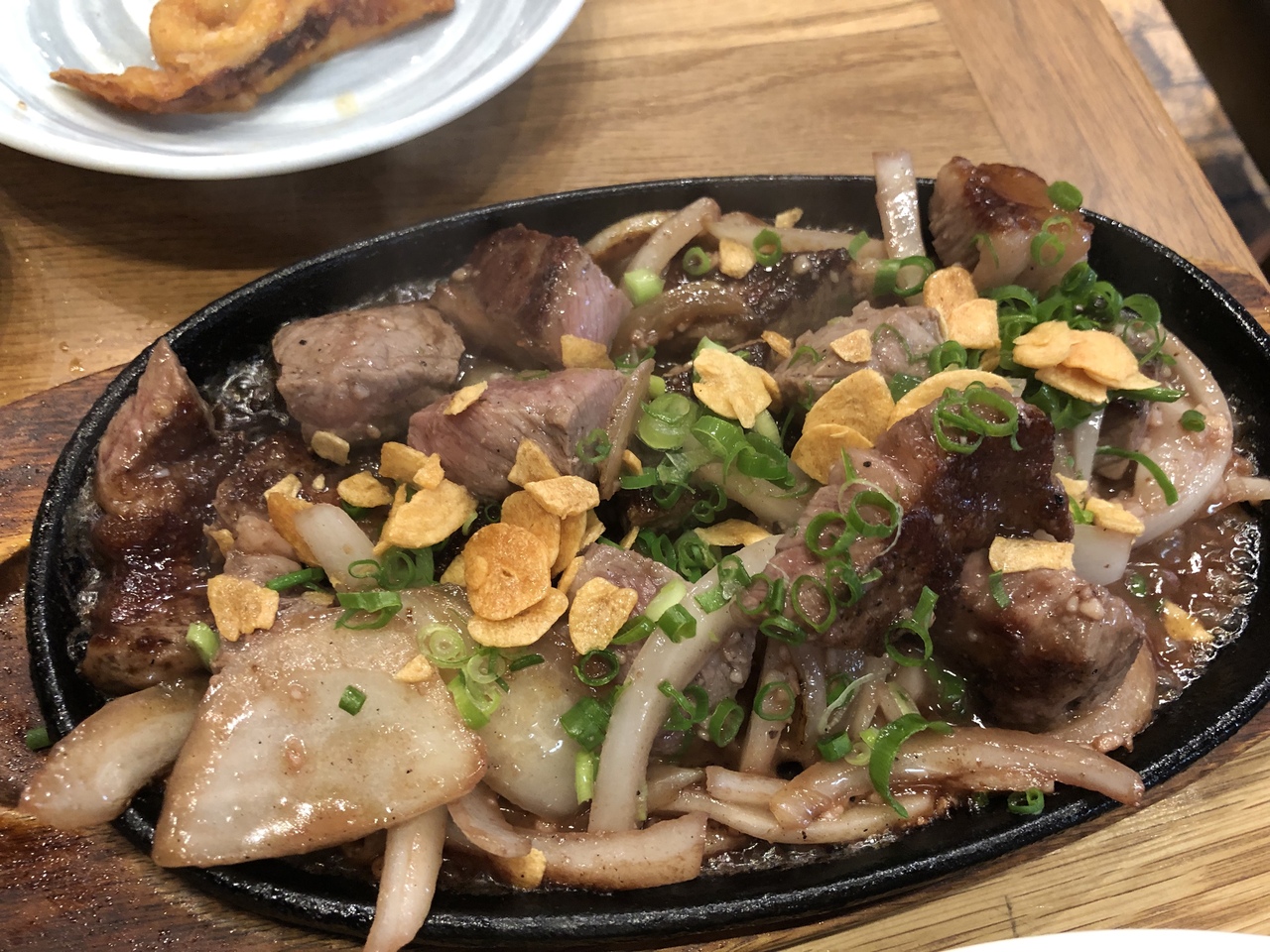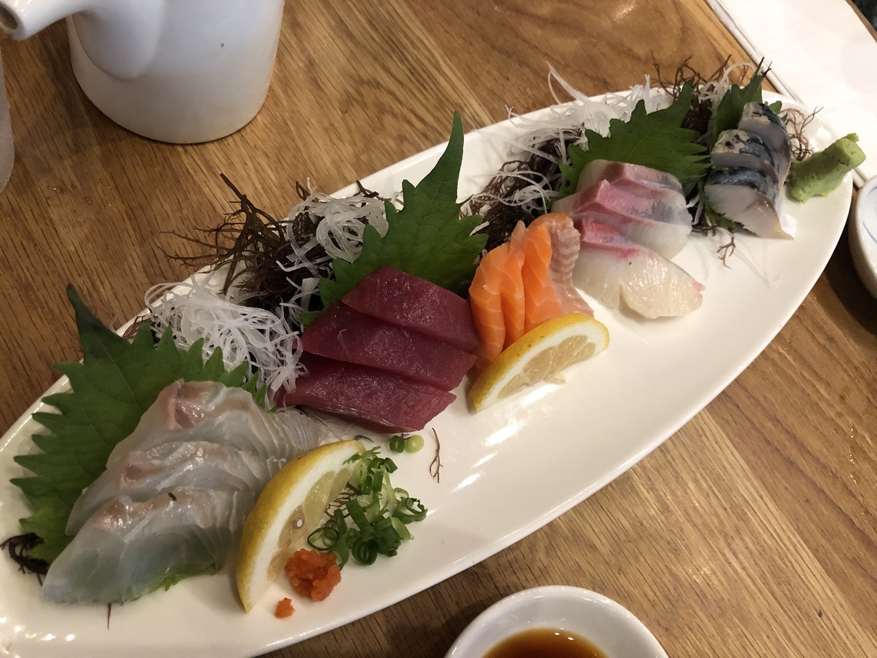 料理は最初にイカのから揚げ、餃子、刺身盛り合わせ、リブアイステーキなどを注文しましたがどれも出てくるのが早くてびっくりしました。