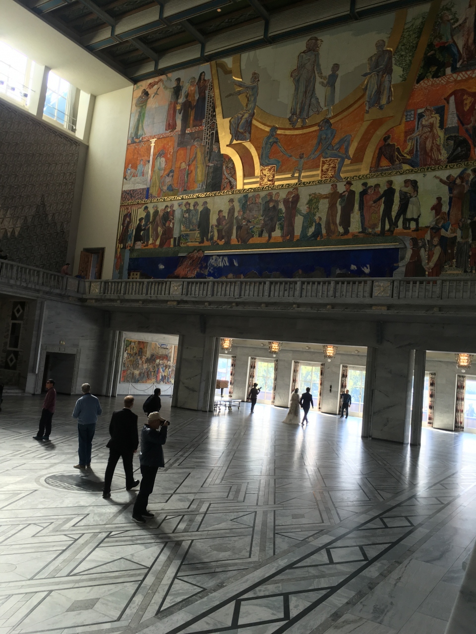 裏に回って入るですが、そこには噴水があって、興味深い木彫の壁画も一面あります。扉を開いて入ったらすぐ広い空間に巨大な壁画が目に飛び入り、圧倒されました。大階段から二階へ上がり、二階の各部屋にも壁画が飾られていて、本当に魅了されました。