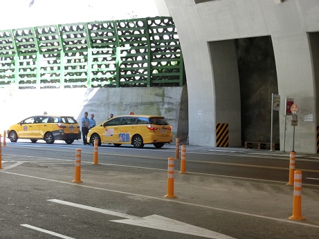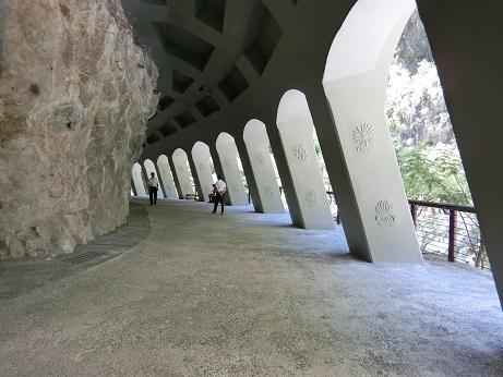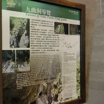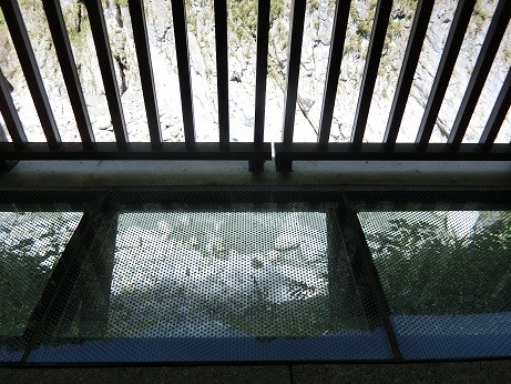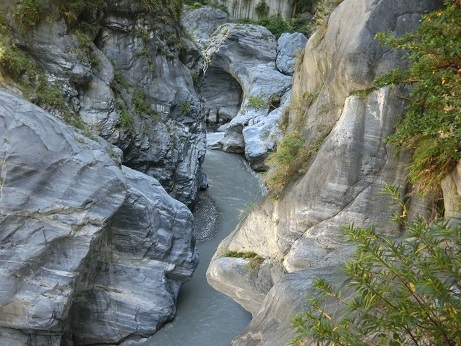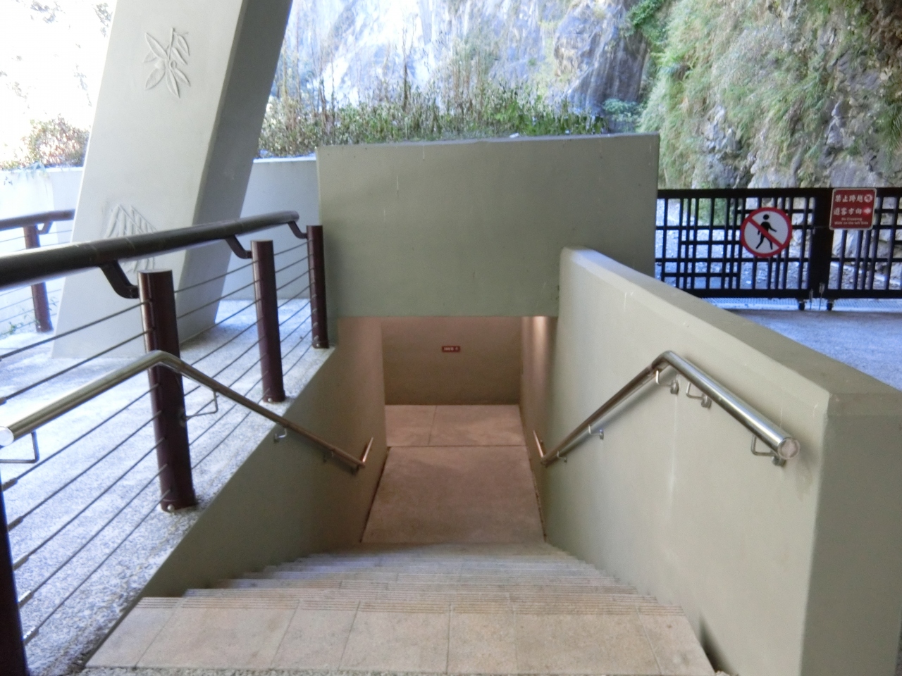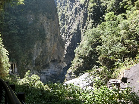 KKDAYタロコ半日チャーターの立ち寄り場所。大きなトンネル 九曲トンネルの近くの道で止まり、ここから歩けと。広い車道を大急ぎで渡って、渓谷沿いの道を歩いていったら、近代建築、渓谷の美観を損なわないような建造物があり、突き当りまで歩いて引き返しました。景色はホントに、川が曲がっていて、綺麗でした。