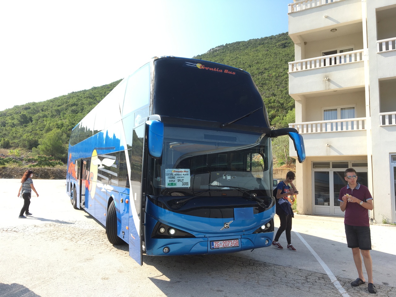 ドブロブニクからスプリットまで長距離バスを利用しました。南区間のドブロブニクから国境までは、一般道の海岸線に沿って走るので、島々や海岸に浮かぶヨット、連なる赤い家並と車窓は最高でした。国境からスプリットまでの北区間は高速道路経由でした。ドブロブニクからは左側、スプリットからは右側席がオススメです。