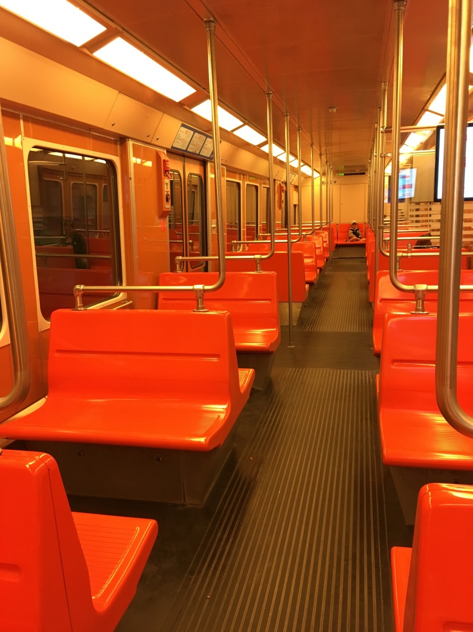 東西に伸びる地下鉄(地上にも一部でます)あまりにもトラムが便利のためなかなか乗る機会がないと思い乗り放題パスも使えるから利用しないともったいないという気持ちで乗りました。乗客はとても少なくてホームにだれもいないこともしばしばですが、車体も車内もオレンジでカッコいいです。