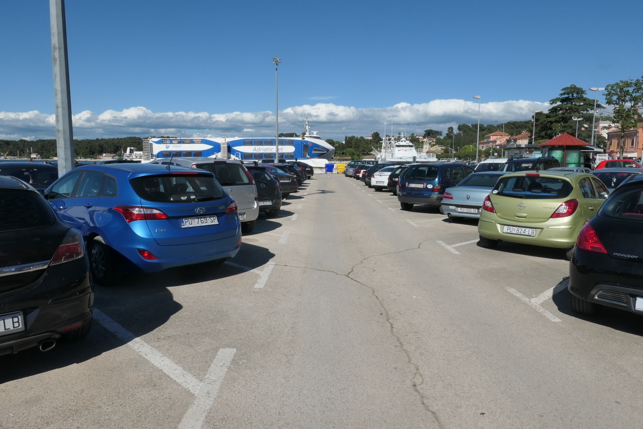 ロヴィニをレンタカーで訪問し、旧市街を観光しました。旧市街にはレンタカーでは入れませんので、駐車場を地図で探すと、旧市街北側の港に広い駐車場があることが分かりました。広い駐車場ですが、殆どのスペースは車で一杯でした。中をグルリと巡って何とか空きスペースを見つけて駐車しました。5月中旬でも殆ど満杯状態でしたので、ハイシーズンでは空きスペースを見つけるのに苦労しそうな感じです。駐車場入り口でチケットを受領し、自動機で精算処理をして、出口機にチケットを挿入するとバーが開く方式です。