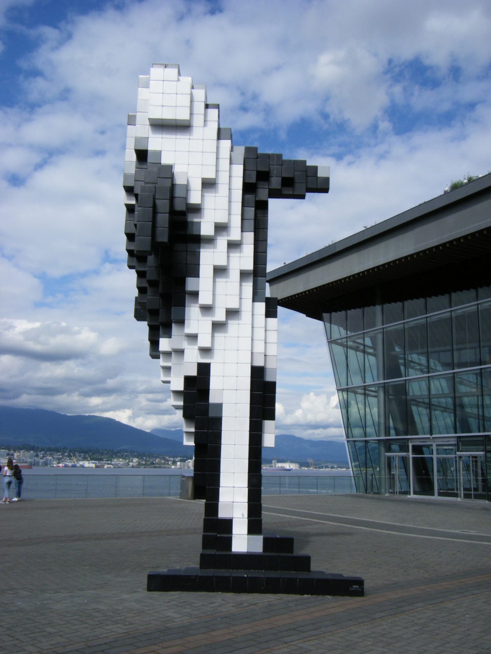 バンクーバーのコールハーバー地区、コンベンションセンターの建物の上にこちらの像はありました。ピクセルのように表現されたシャチの像になります。バンクーバーではシャチやクジラが沖合で良く見ることができるということで、人気のある動物のようです。ただ、人気で人が集まるコールハーバー地区にありますが、こちらの像にはあまりたくさんの人が集まってくるという事はなく、静かにゆっくりと見学する事ができました。
