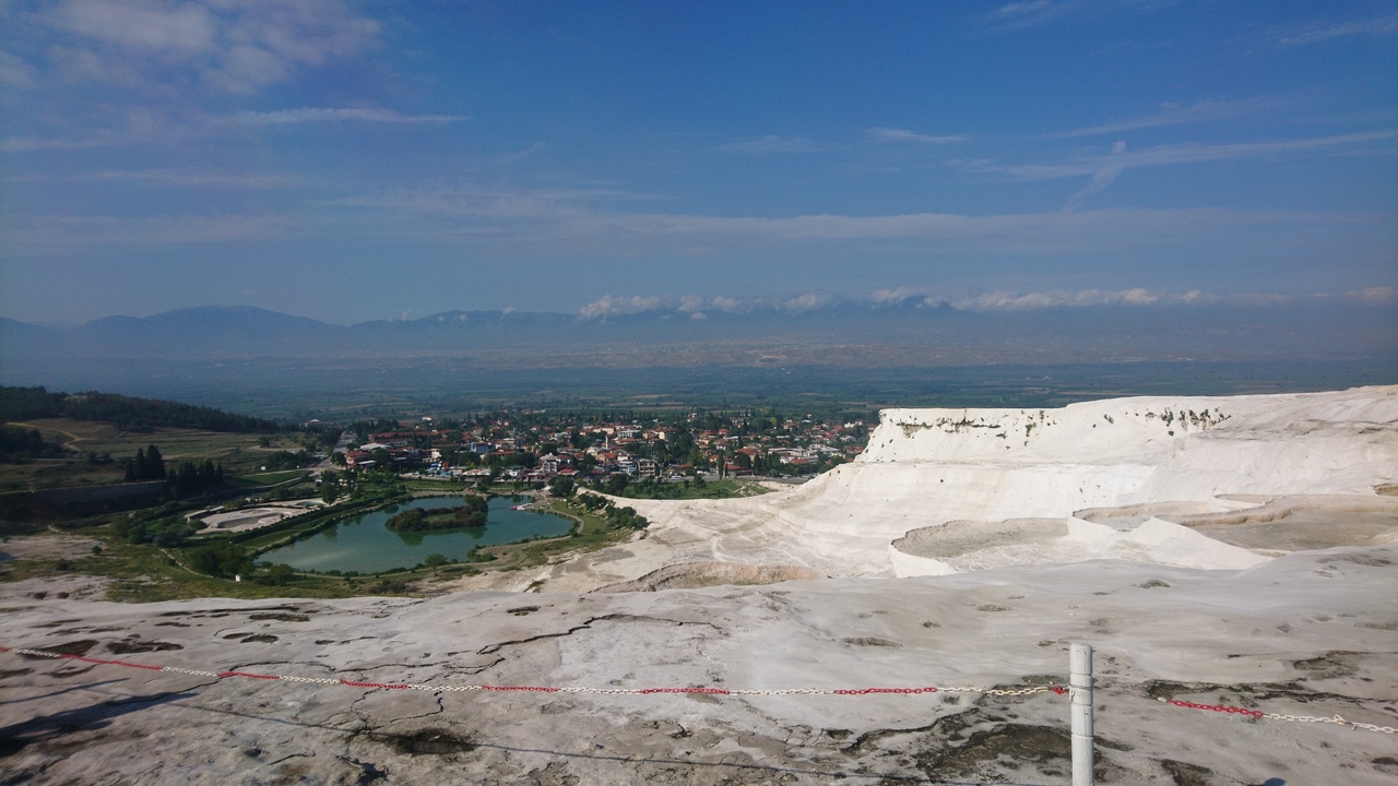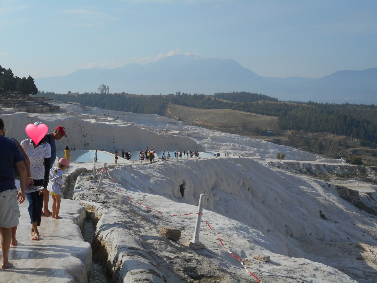 ガイドブックで見るほど白い石灰棚に水はなく、数少ない水のある棚に観光客が殺到しているといった感じでした。6月下旬に訪れたので水着で泳いでいる人もいましたが、多くの人は足湯を楽しんでいるように見えました。ちなみに石灰棚の中は土足厳禁です。岩がごつごつしている上にぬるぬるして滑るので、歩く時は要注意です。