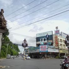 交差点に立つ4つの信号機の上に原始人が…。まったく意味不明です。なぜに原始人なのか?クラビーは原始人で有名?原人の骨でも発掘された?などいろいろ疑問がありますが、とにもかくにもアートです。その証拠に北約250mの信号にはサーベルタイガーがいます。それに市内のあちこちにカニや鷹、その他抽象的なオブジェが点在しています。クラビーはアートな町ということなのでしょう。