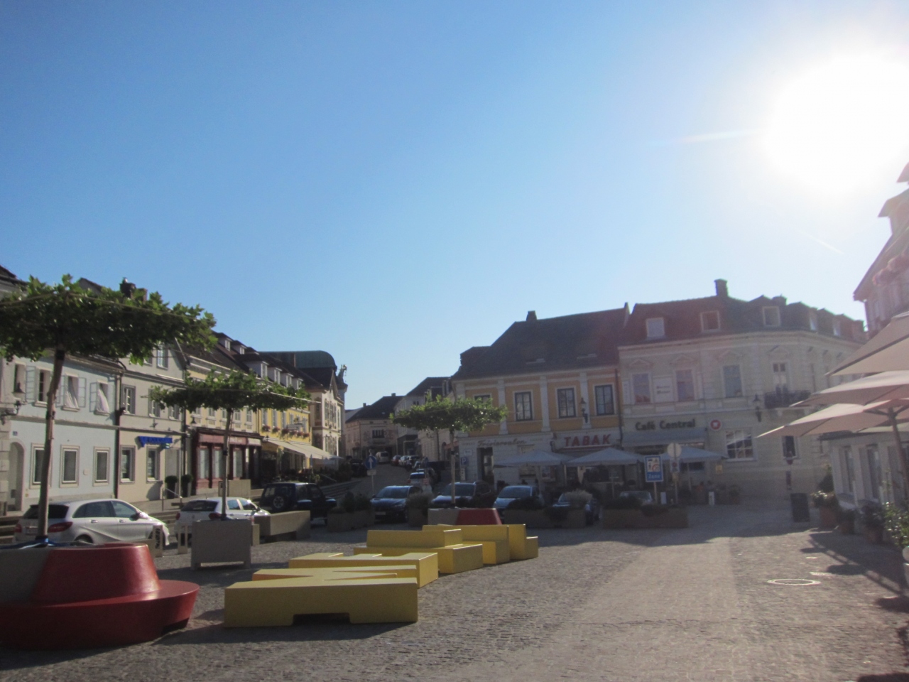 メルクのメインストリートにある広場です。ちょっと広くなっていて周りにレストランがありました。暑い日の夕方でしたので人は誰もいませんでした。涼しくなれば人も出で来るのでしょう。ライトアップをする様子はありませんでした。