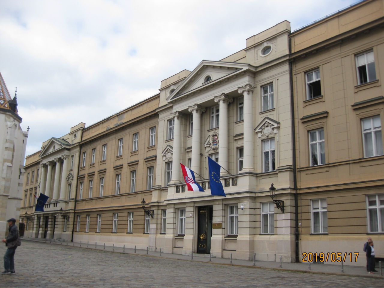 聖マルコ教会の側に、クロアチアとユーロの旗がある建物がありました。