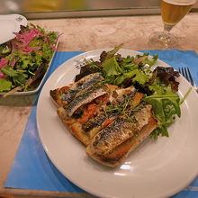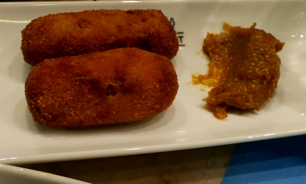 リベイラ市場には大きなフードコートがあるが,この店は少し離れて少し静かだ.魚料理の得意な店.ビール 400ml 3.2ユーロとイワシ料理 焼いたのが香草とともにパンの上に載っている.9.8ユーロ サラダ2.5ユーロ 赤ワインのグラスは少しいいフルボディで5.6ユーロ 炭酸水1.5ユーロ ちょっと足らなかったのでクロケット 4.5ユーロ 甘いオレンジソース付き イワシもうまく焼いて調理してあり,南欧風の味付け おいしかった ここはこの前のAzulに比べ簡単に食べるのにいい店だ