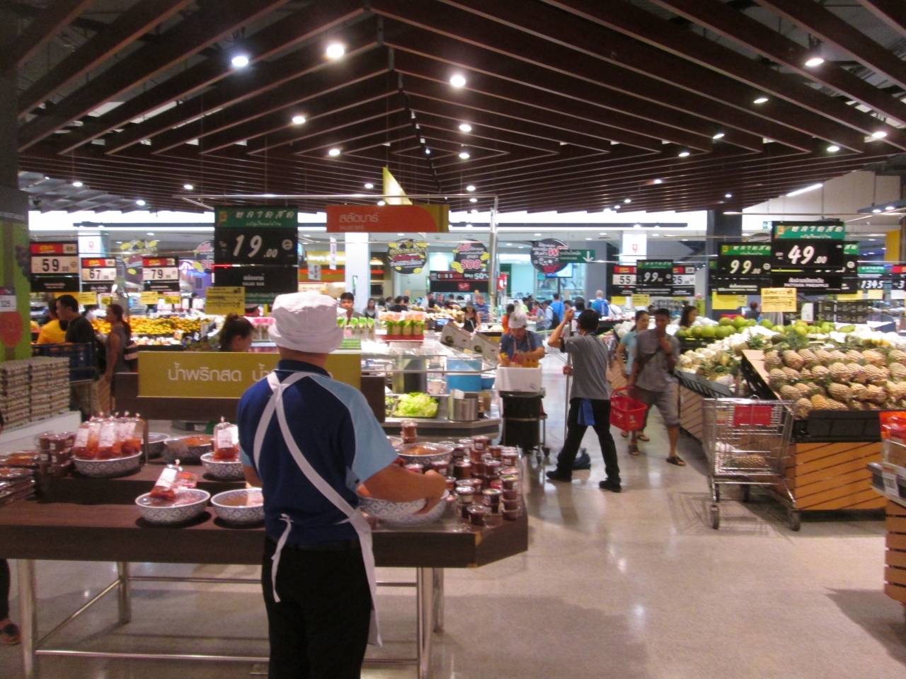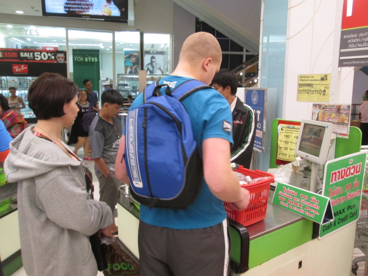 ビッグC(ラチャダムリ店)の会計レジはとにかく混雑します。2階のスーパーは15台以上のレジが稼働していましたがそれでも行列ができていました。10個以内、現金支払いの場合、向かって左右の場所にファストレーンがあるので、そこに向かいましょう。2つのアイテムの購入でしたが早く会計を済ますことができました。