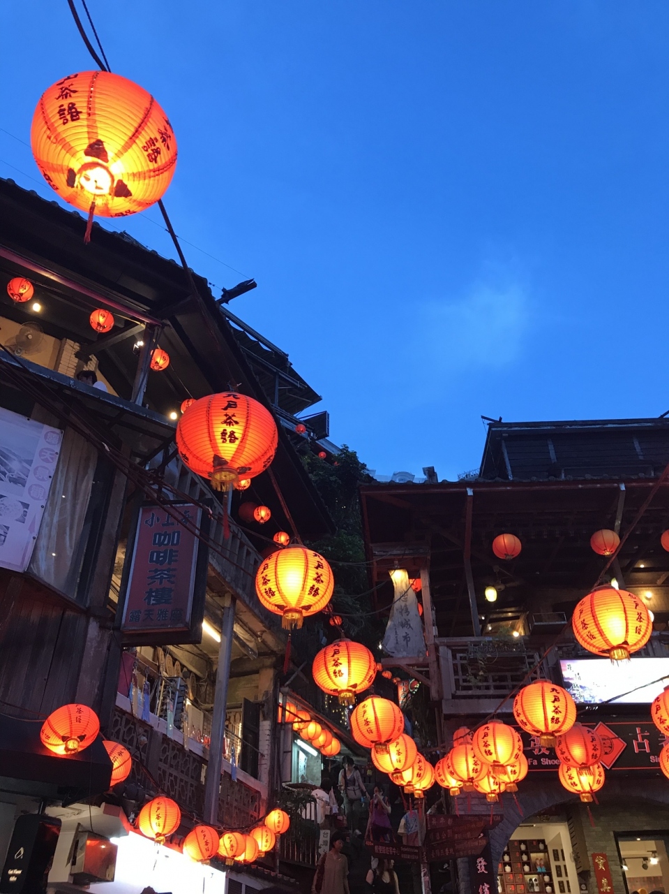 7月の日没18:30ごろを目指して行きました。平日でも結構な人混みで、なかなか情緒あふれる雰囲気とはいきません。それでも、日が沈んだ後の提灯が灯る風景は幻想的で、台北とはまた違ったノスタルジーが味わえます。