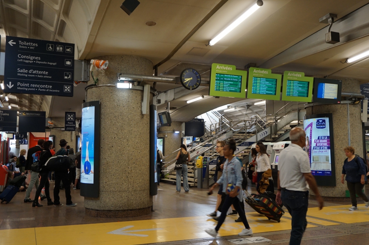 なお、駅自体はたくさんの乗客が乗降する大きな駅です。フランス国鉄の窓口はもちろんのこと、PAUL、スタバも入っていますし、電車を待つためのスペースもあります。有料トイレ(0.9ユーロ)は駅の外でした。