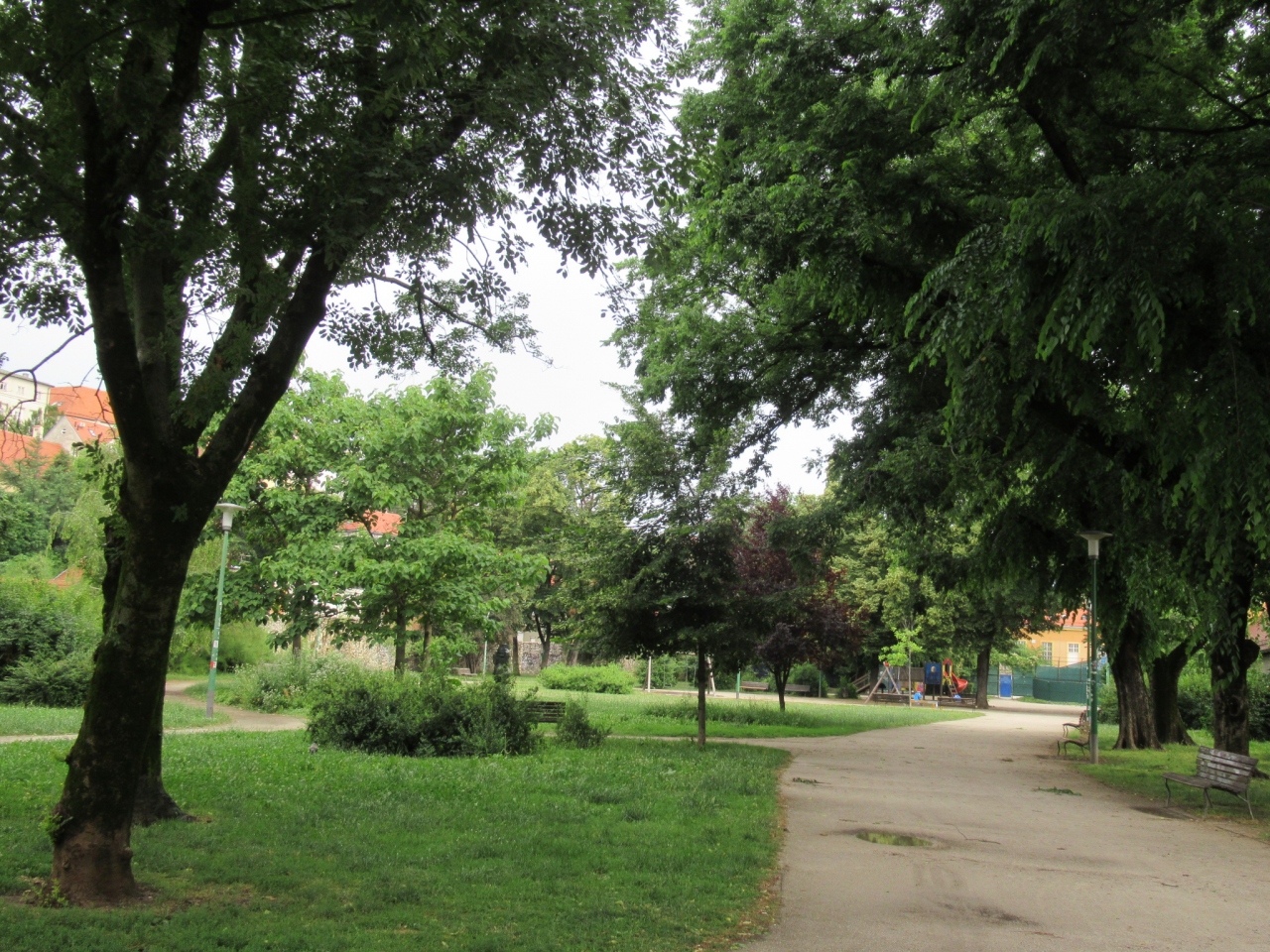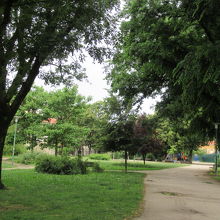 大聖堂の前の通りを北へ、坂を上っていき、聖フラーニョ教会に辿り着いたら、教会の向かいにこちらの公園がありました。観光客が行き交う旧市街にあるとは思えない静かな公園でした。緑豊かな中、ブランコやベンチが置いてあり、市民の憩いの場だと思います。