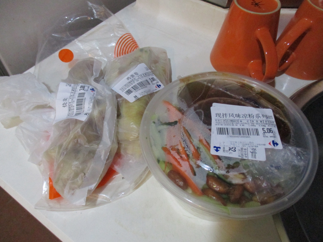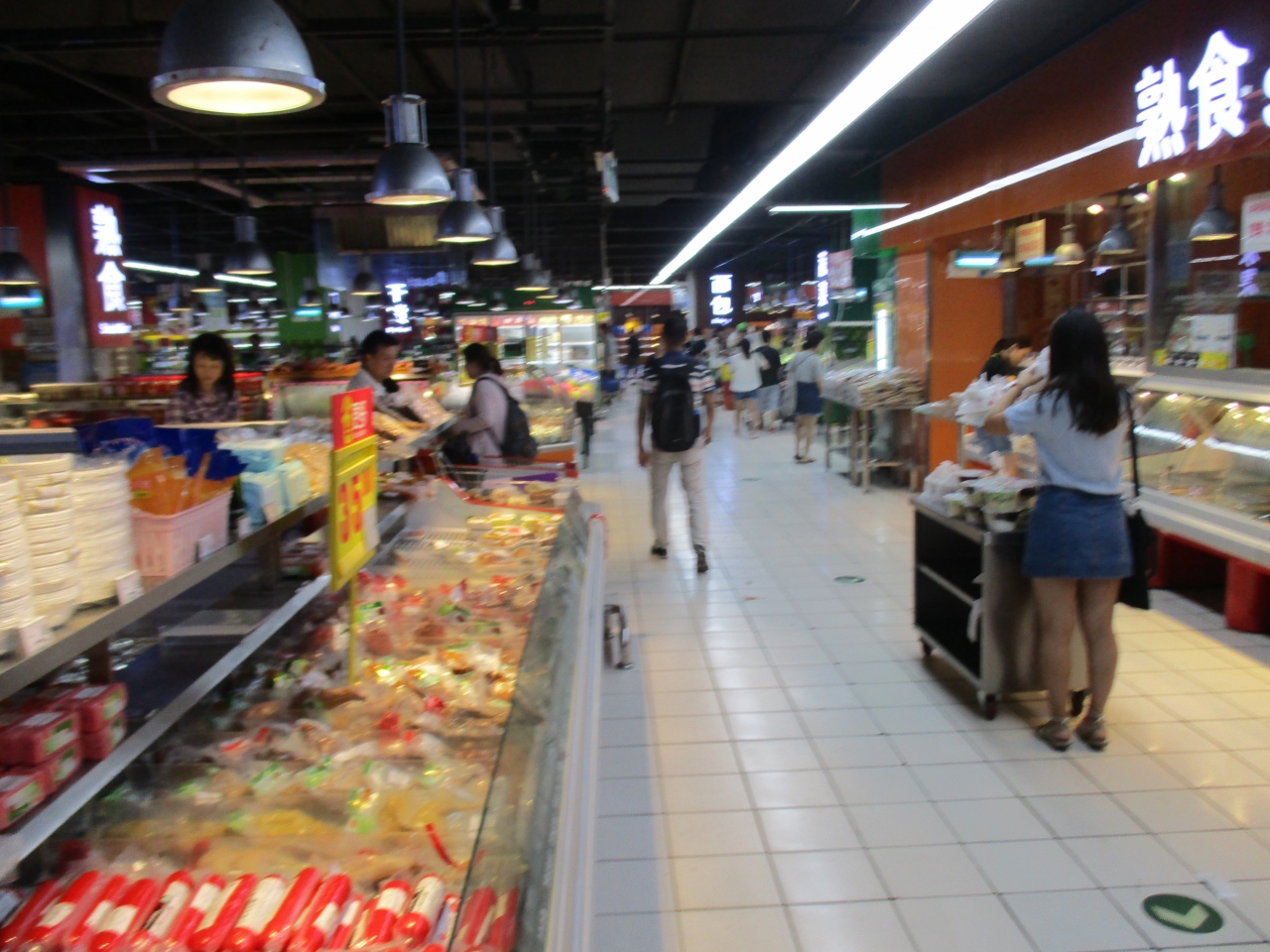 上海の人の生活を支える大型スーパーで、おいしそうな食料品がいっぱいでした。試しに惣菜コーナーで中国定番の点心と即席の麺料理を買ってみました。味はレストランのメニューとはいきませんでしたが、コンビニより値段が安くまだ温かったので満足しました。