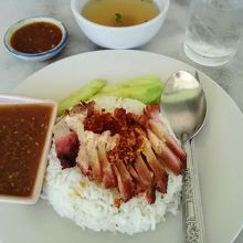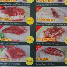 カオマンガイ(鶏飯)やカオムーデン(チャーシュー飯)、チャーシュー麺で知られている店です。メニューも写真付き(英語併記)、値段表示ありでとても注文しやすいです。どれも普通盛り50B、大盛りは60Bという値段です。
