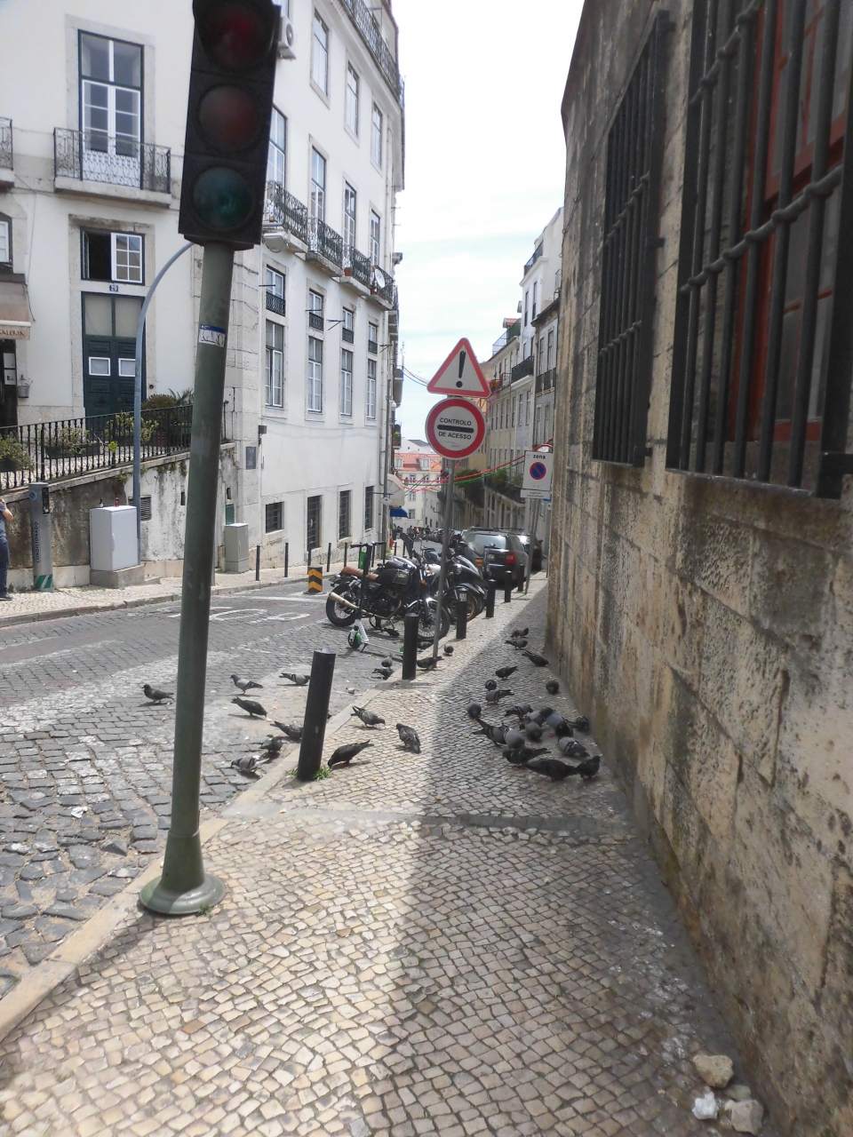 大聖堂の真横を通るAugusto Rosa通りは、サンタ・ルジア展望台方面の路面電車の路線が通る道と、この下りのバラン通りに分離します。名所がある訳でもなく、あまり印象に残らない通りですが、鳩が群れて餌をついばんでいました。この通りをずっと降りていけば、くちばしの家近辺に出ます。