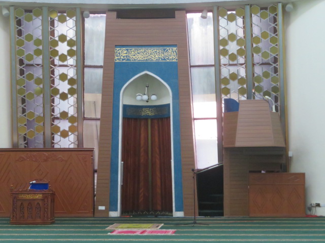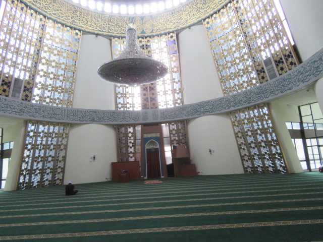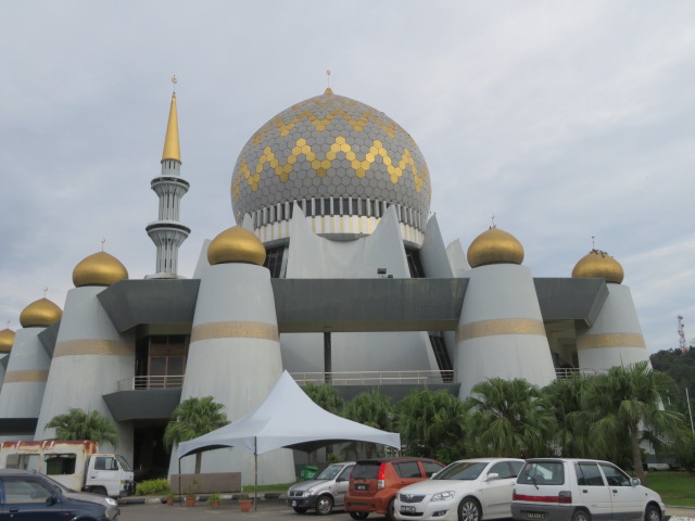コタキナバル市街のスンブラン地区にある近代的で大きなイスラム建築のモスク、高さ約66mの黄金のドーム、16の小さなドームで出来ています、行った時がお祈りの時間ではなかったので入りました、靴を脱いで大理石の床を歩いて内部に入りました、5000人も入れるので広いです、人が居なかったので静かでした。