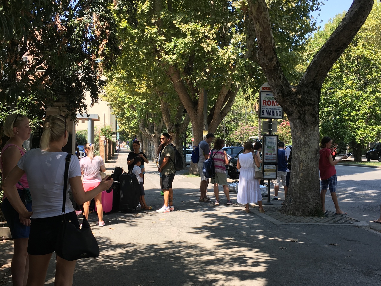 リミニのバス停は、駅を出て反対側の道路へ渡った右手側、バーガーキングの前にバス停があります。夏季は人がたくさんいるのでわかるかと思います。満席になると立ち乗りになります。大きい荷物は荷物入れに預けましょう。