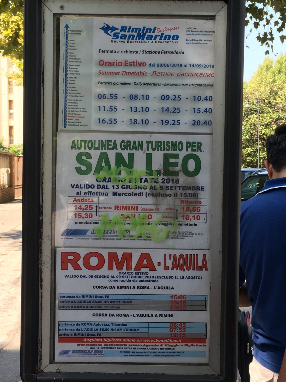 片道5ユーロ・往復10ユーロ、乗車時間は約45分。チケットはバス車内でもリミニのバス停近くのタバッキでも買うことができます。看板があるのでわかると思います。