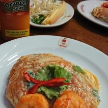 オープン30分前に到着して一時間待ち。観光客に大人気のパッタイ屋さん。行く度に値上がりをしてて、今回行ってみると、120バーツに。以前は無かったスペシャルバージョンの高級メニューが増え、その一番高い一人前500バーツのパッタイをオーダーする人は、行列があれど一番前に割り込める、という完全に金の亡者。その分お店が綺麗になり、エアコン付きになりましたが、オレンジジュースの大サイズがパッタイより高い160バーツって…。果肉ゴロゴロで美味しいのですが、現地の物価を考えると高過ぎです。お店の前で炎を上げながら次々と出来上がるパッタイを見るのは楽しいですが、一時間待つほど感動する味ではありません。今はショッピングモールのフードコートに出店しているので、もうわざわざアクセスカウンター悪い本店には行かないかな?
