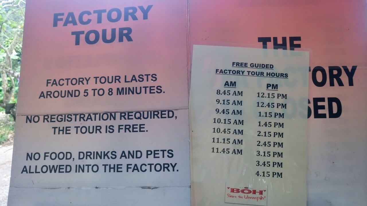 メインの建物 (カフェ 及び 販売店) に併設された BOH TEA の製造工場見学ツアー (Factory Tour)。時間が決まっており、それまで工場入口で待機。先着順、登録不要、英語 / マレー語での案内。所要時間: 約 10分