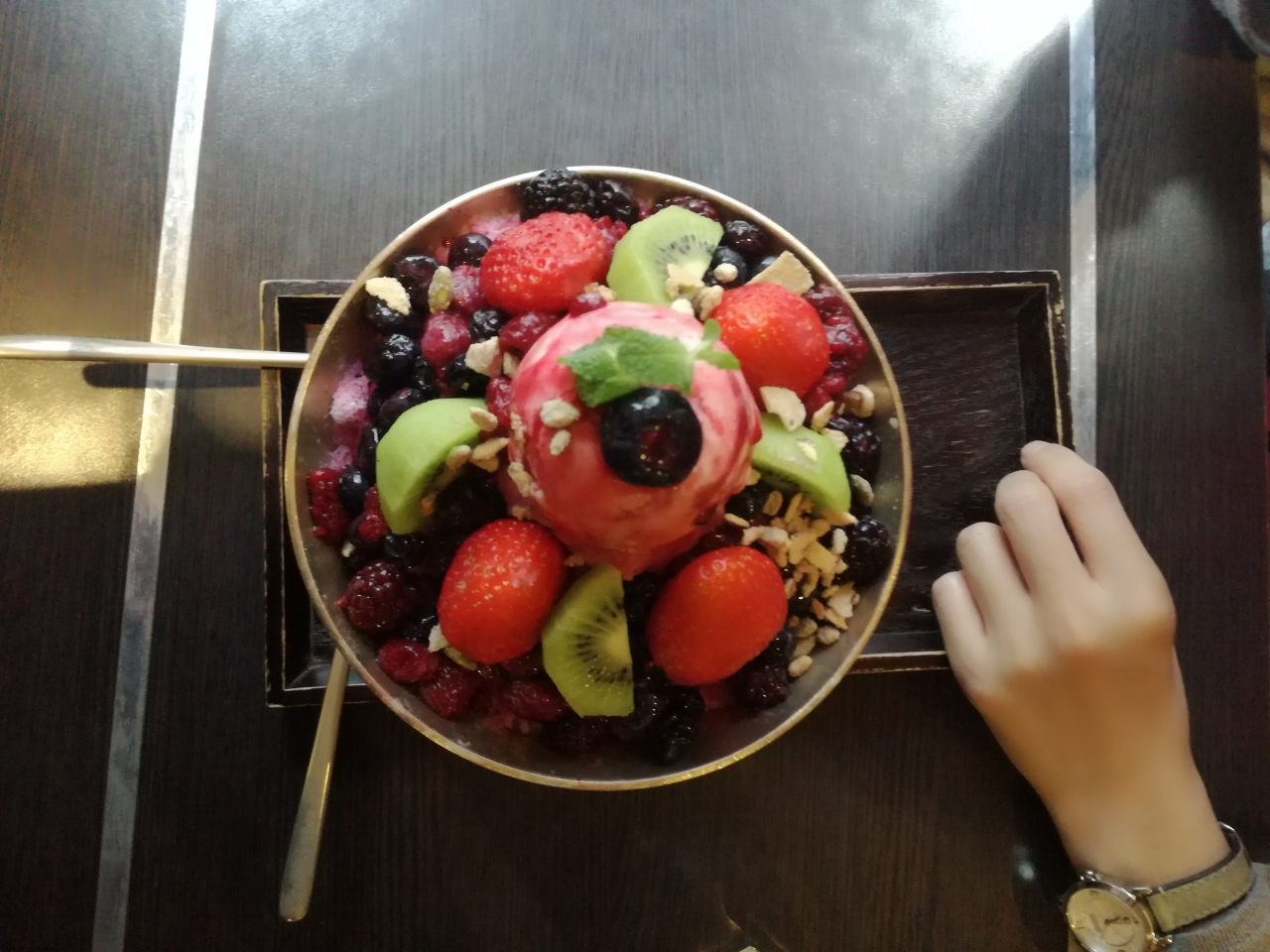 明洞にあるおしゃれなかき氷店。主にフルーツがたくさん、そして見た目もインスタ映えする韓国風かき氷(パッピンス)です。器とスプーンが韓国ならではのステンレス製で見た目も涼し気でした。店舗は2階にありました。結構ボリューミーで私たちは1つを3人でシェアしました。