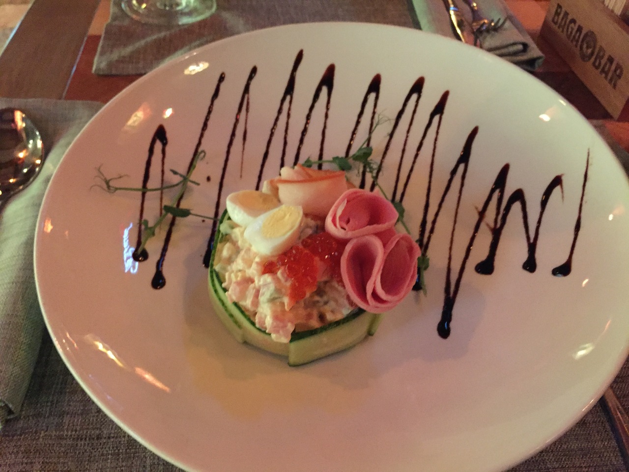 メニューは各国料理が揃ってますが、私は当然ロシア料理をチョイス。ロシア風サラダ、ボルシチ、黒パンを黒ビールとウォッカで頂き、初日の長時間フライトの疲れを癒すことが出来ました。