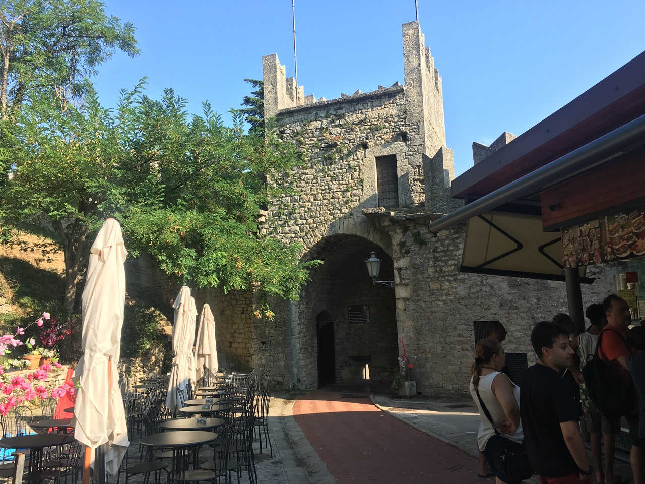 サンマリノに建つ3つの要塞=スリーシスターズのうち、市街地から最初に着くのがこのグアイタ塔。とてもしっかりした作りで広く、教会なども内部にあります。こちらから眺める第2の塔がいい感じですが、眺め自体は第2のチェスタの方がいいです。