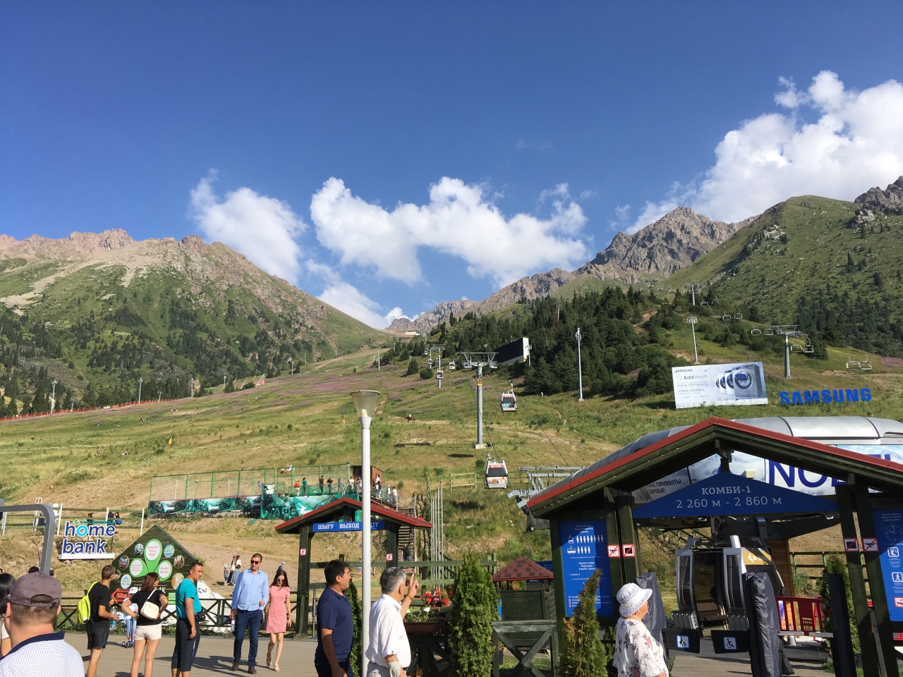 アルマティのカザフスタンホテル前のバス停から12番のバスで30分くらいでメデウのスケートリンクへ。ここからロープウェイもしくはシャトルバスでスキー場に向かいます。ロープウェイに乗る場合はスケートリンクの一つ手前のバス停で降り、ゲレンデまで片道2000テンゲ、往復3000テンゲです。ゲレンデの麓は標高2250mで、夏でもさらにロープウェイを乗り継いで頂上を目指せます。ただ、ゲレンデからのロープウェイの営業時間は午後5時までなので注意が必要です。私は午後5時過ぎに到着したので、頂上に登ることはできませんでした。スケートリンクとの往復のロープウェイは午後6時まで営業しています。ゲレンデにはレストランやホテルが整い、別荘のような建物が立ち並び小規模ですがスイスのような雰囲気です。また、シャトルバスはチケット販売のブースがスケートリンクの前にあり、料金は500テンゲで午後8時まで。バスは乗客が集まり次第出発という感じで、頻発しています。