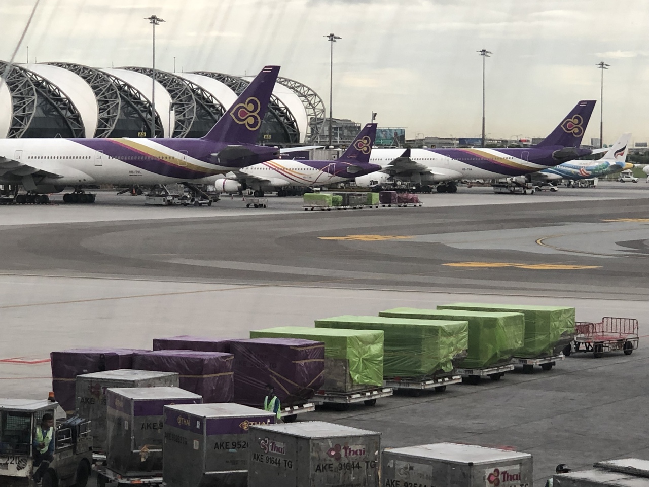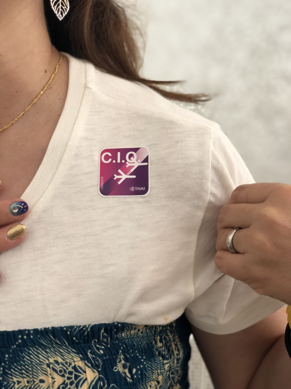 とにかく広いです。JALで到着して タイ国際航空プーケット行きの乗り換えは、サインで見たら835メートル。乗り換えで胸にシールを貼られます。これはバンコクは 国内から乗ってくる人と、国際線から移動してくる人の荷物のターンテーブルが違うので、その目印だそうです。