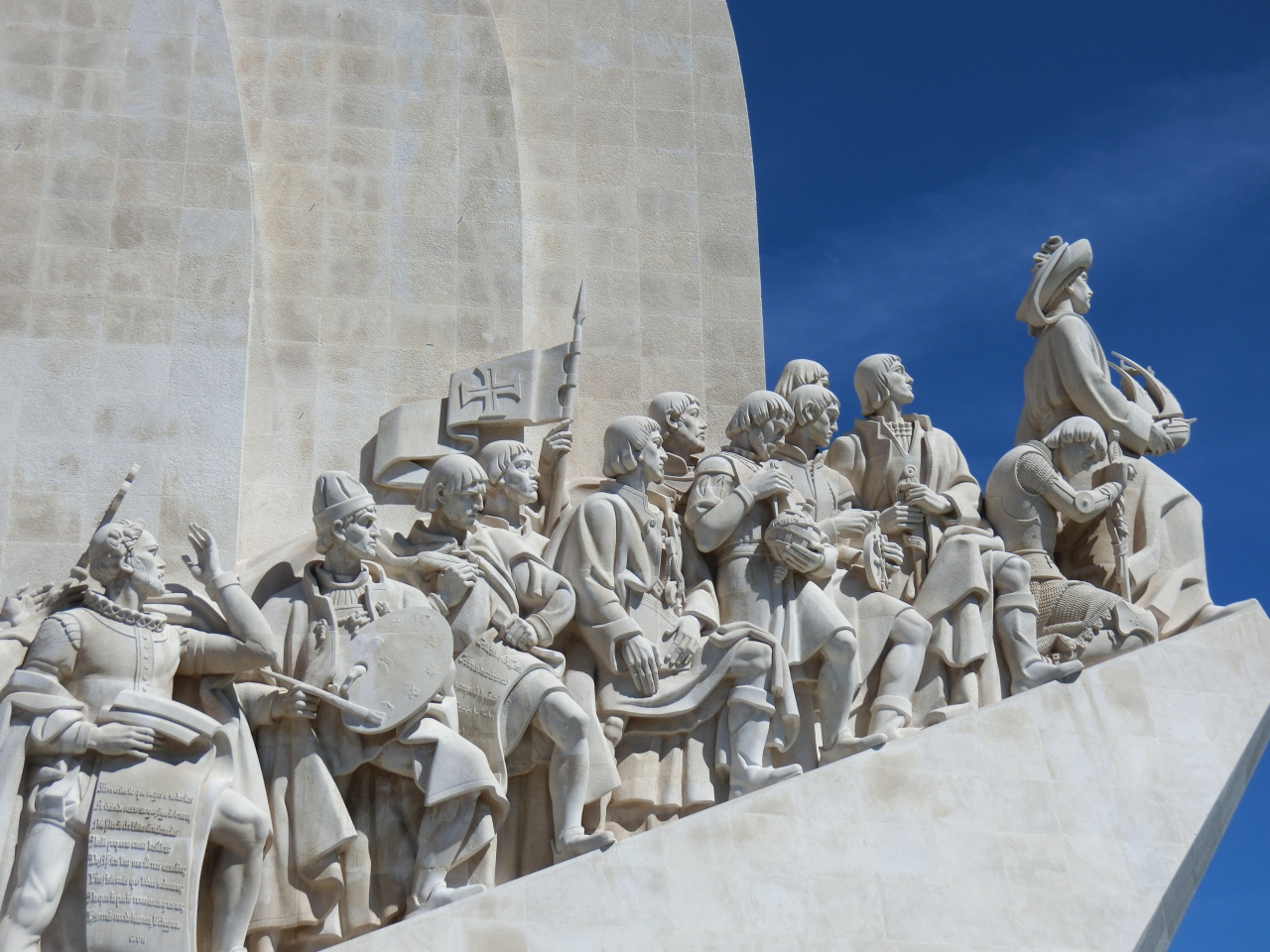トラムは発見のモニュメントまで行っていないので、ジェロモニス修道院で降ります。ジェロモニス修道院の目の前に大通りがあるので、ここは地下道を通っていきます。近くまで行くと大きいです。高さが52mあるそうです。エレベーターで上に上がることができますが、ここでは入りませんでした。先頭にエンリケ王子が立ち、33人の偉人が海の方向を向き勇ましく立っています。