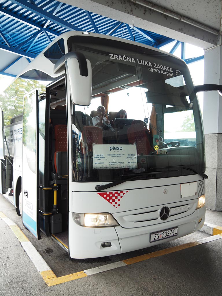 最初、乗り場が何処か分からなかったのですが、スーツケースを持って待っている人が沢山いたのと、バスの窓の所に「pleso(空港バスの会社名)」と書いてあったので分かりました。