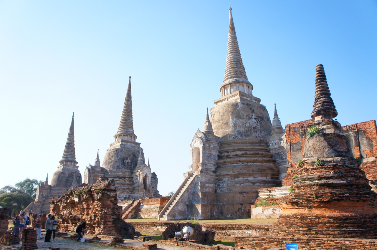 アユタヤにある遺跡のひとつです。こちらの遺跡には大きな仏塔が3つ並んでおり、仏塔の階段は観光客も登れるようになっていました。この仏塔は昔の王様の遺骨がおさめられているお墓なのだそうです。昔の戦争で破壊されたものが修復されて現在に至るそうです。