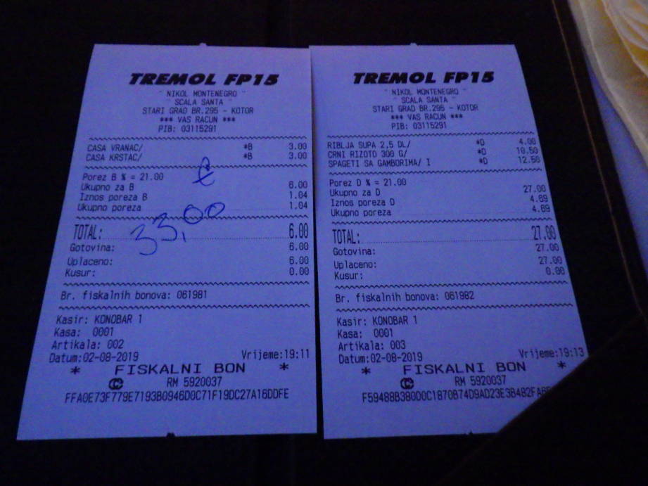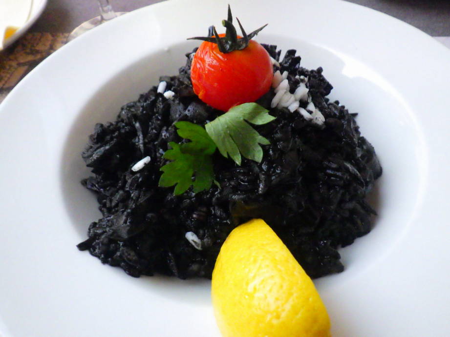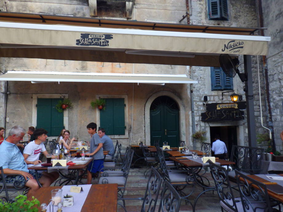 夕飯でKonoba Scala Santaに19時頃伺いました。スムーズに座れましたがやがて満席になりました。かなりの人気店だと思います。ブラックリゾット(イカスミのリゾット)10.5 EURO、 エビとサフランのスパゲティは12.5 EURO 魚のスープは4 EURO、 地元のワインはグラスで3 EURO でした。 旧市街の中心にありロケーションと雰囲気はとても良かったです。 ブラックリゾットはもう少しイカスミの香りがすると良かったです。 エビとサフランももう少しエビの香りがすると嬉しかったです。 一皿の量がとても多いので、日本人は二人で一皿をシェアするぐらいでちょうどいいと思います。