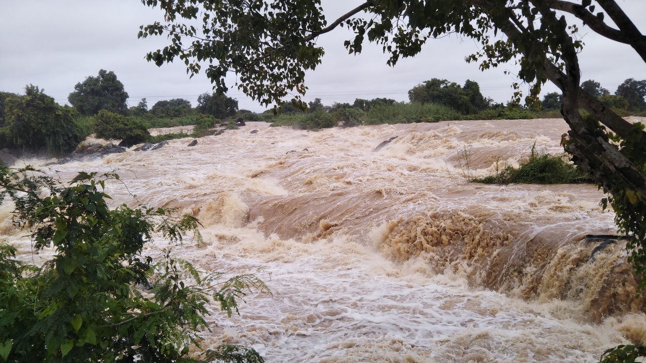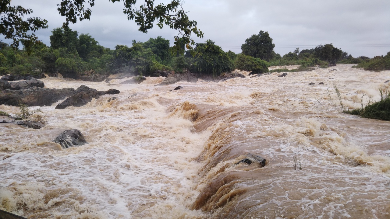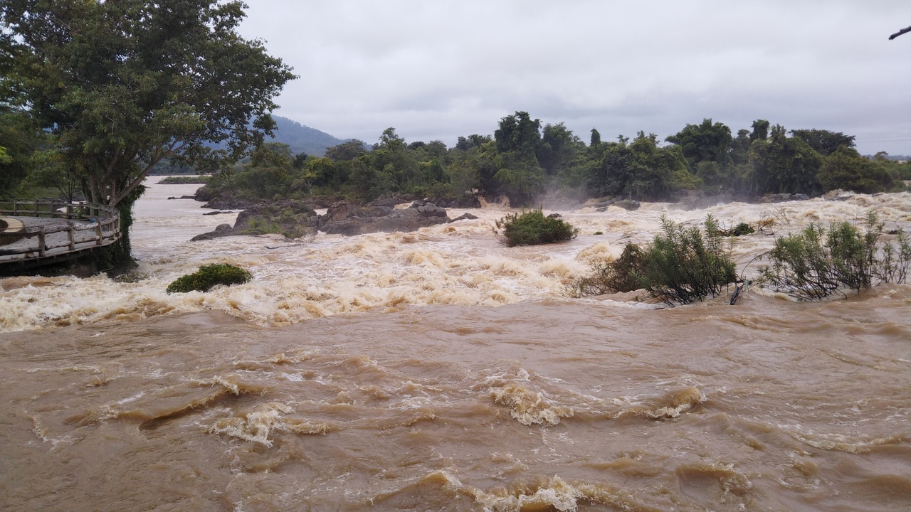 日本語ガイドブックには「ゴツゴツと水面から顔を出した岩の間を、まるで竜が踊るがごとく水流が落ちていく」(『地球の歩き方、ラオス、2019~2020年版』186ページ)とあるが、雨季で増水しているためか、岩はほとんど見えない。
