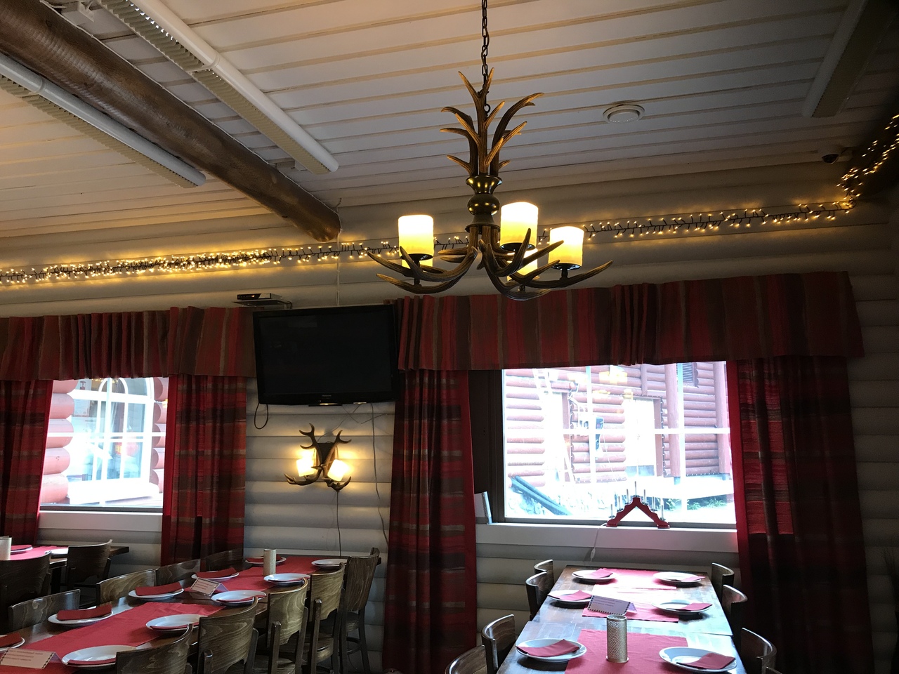 クリスマスムード満点なレストランです。ホテルの朝食会場でした。種類が豊富でデザートまであり楽しかったです。クリスマスツリーもいたるところにあり、トナカイの角風シャンデリアなど雰囲気も素敵でした。食事も美味しかったです。