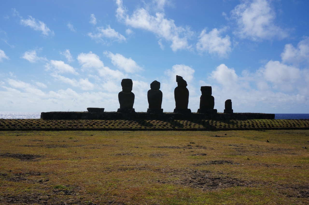 イースター島の中心部であるハンガロア村から歩いていける距離にあるタハイ儀式村にあるモアイです。タハイ儀式村には3つのモアイがありますが、このモアイは1体だけで少し離れてありました。モアイの近くには近づかないように注意標識がありました。