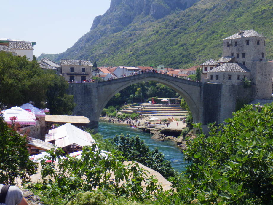 Focaから車で3時間ぐらいでモスタルに到着しました。スターリモスト橋のすぐ近くの駐車場に1時間2マルカで駐車してスターリモスト橋に向かいました。スターリモスト橋渡り橋の上からネレトヴァ川を見下ろすと、飛び込みを披露している人がいました。橋の一番上から川まではとても高く、ここから飛び込む人はいるということに驚きました。