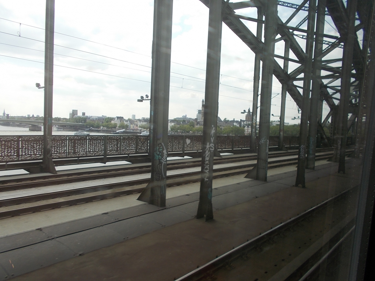 このホーエンツォレルン橋はケルンの旧市街地の東側を流れるライン川の上にかかる鉄橋です。この鉄橋にドイツの鉄道が通過しています。その鉄道の脇に歩道があります。橋を歩いて渡るの20から30分程度かかった感じです。また橋には騎馬像がたてられています。印象に残る鉄橋です。