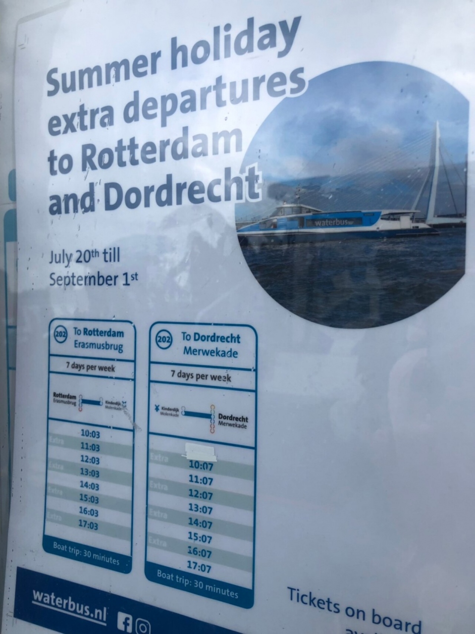 キンデルダイクへは5月~10月は水上バスで直接行けます。その期間でも地球の歩き方に1日4~5本とあり、ネットで時刻表を予め(1ヶ月ぐらい前?)検索しておきました。調べておいた予定時刻の1時間前に乗り場に着いたところ、どうやら夏場は毎時間運航していることがわかり、ラッキーということで慌てて船に乗り込み、そのまま船はすぐに発車しました。
