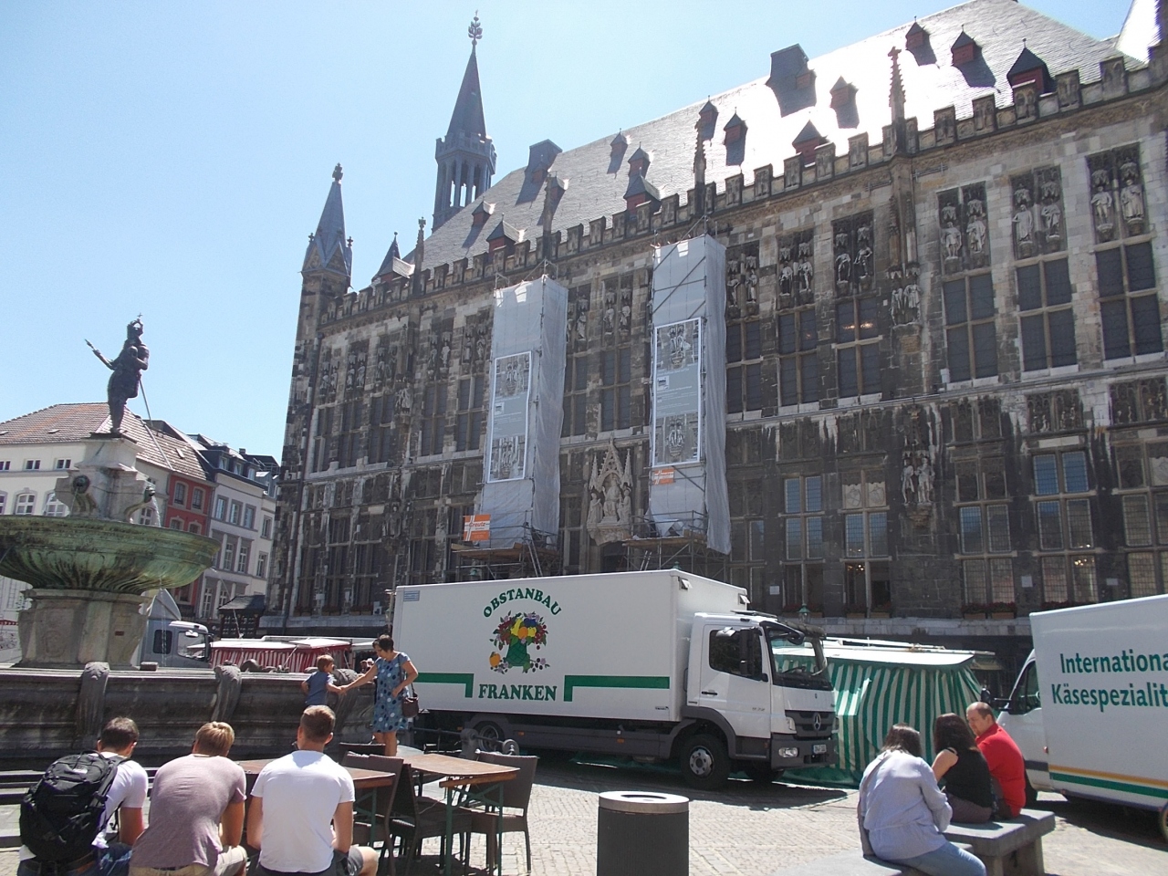 このアーヘンの市庁舎は大聖堂の北側の広場の向かいにあります。大聖堂と市庁舎との間の広場は静かです。市庁舎の正面は北側の広場です。そちらの広場は市場が開かれていて多くの店と人々がいます。外観は古さを感じさせます。大きさもあり重厚な市庁舎です。