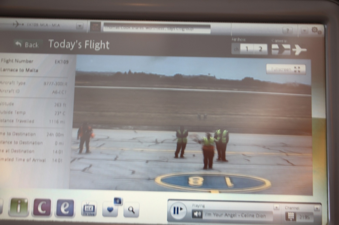 座席モニターには駐機場の係員3人の姿が見えましたが、日本の空港と違って誘導する動作がゆるいですね~